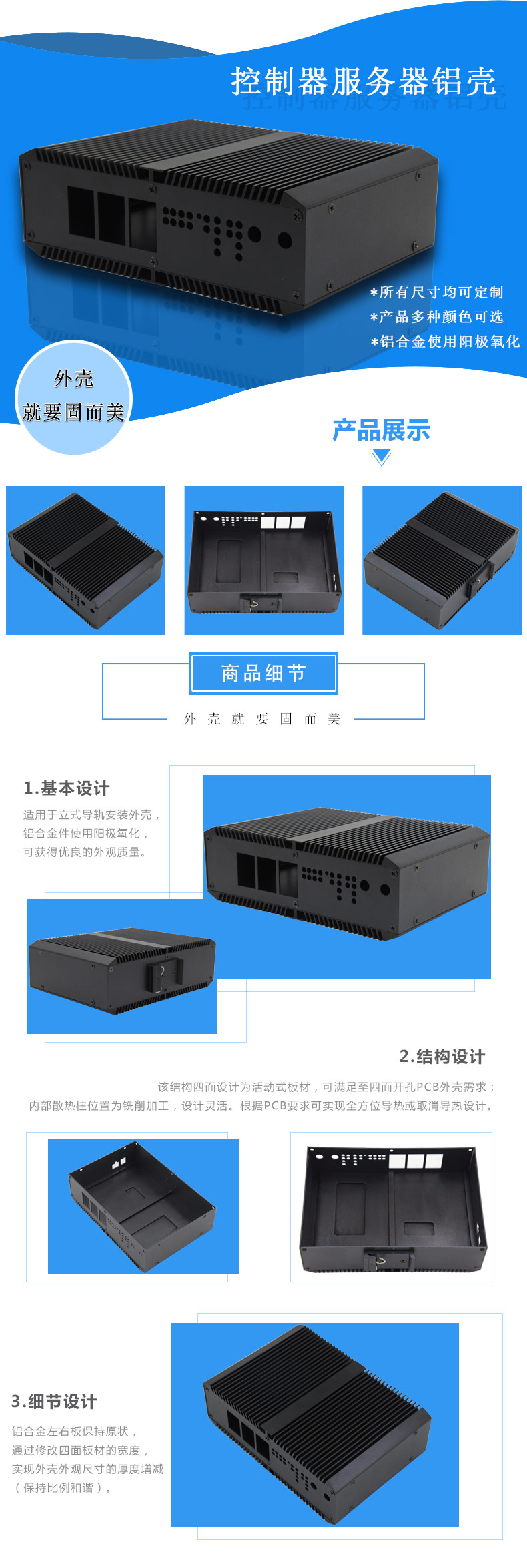 2.該結(jié)構(gòu)四面設(shè)計(jì)為活動(dòng)式板材,可滿足至四面開孔PCB外殼需求